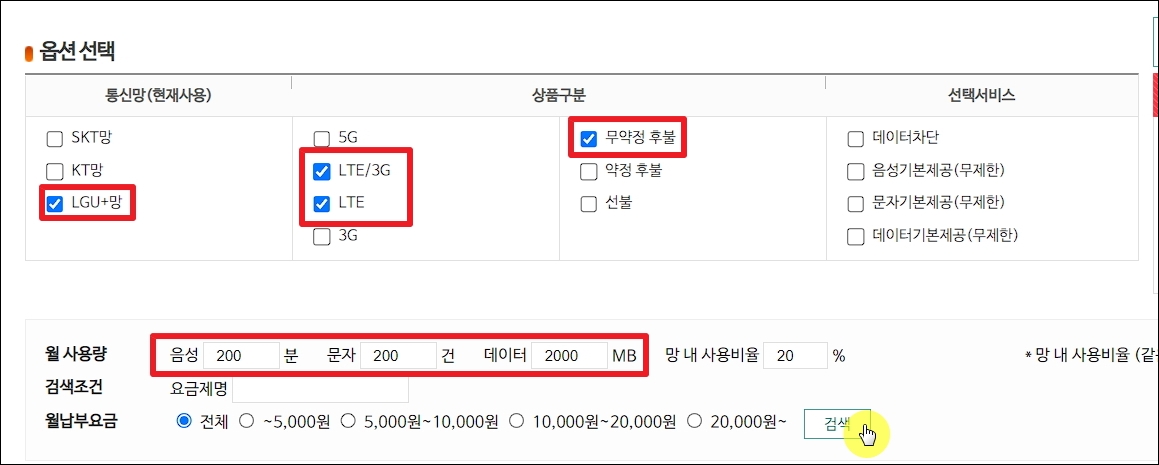 ▼내 마음에 맞는 요금제 찾기 위해서는 다음과 같이 몇 가지 조건을 선택해야 합니다. 일단 옵션에서 LG 유플러스 통신망을 선택하고, 상품 구분에서는 무약정 후불을 체크합니다. 약정이 걸려 있지 않기 때문에 언제든 해지할 수 있어서 사용자에게 유리한 조건입니다. 그 다음으로 음성, 문자, 데이터 이렇게 3가지를 기준으로 월 사용량을 입력해 주세요. 한 달 동안의 스마트폰 사용 패턴을 참고하여 입력하면 됩니다. 다 입력한 후에 [검색] 버튼을 눌러주세요.
