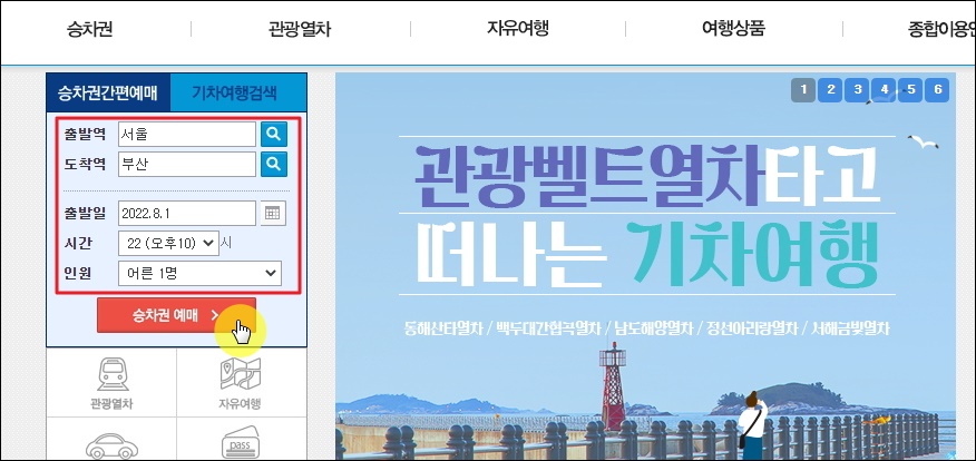 ▼레츠코레일 사이트에 접속했습니다. 메인화면을 보면 좌측 상단에 승차권 간편예매 서비스가 나타나는데요. 여기에서 알아보고 싶은 기차에 대한 정보를 입력해 주세요. 출발역, 도착역, 출발일, 시간, 인원을 정확하게 입력한 후 [승차권 예매] 버튼을 클릭해 봅니다.