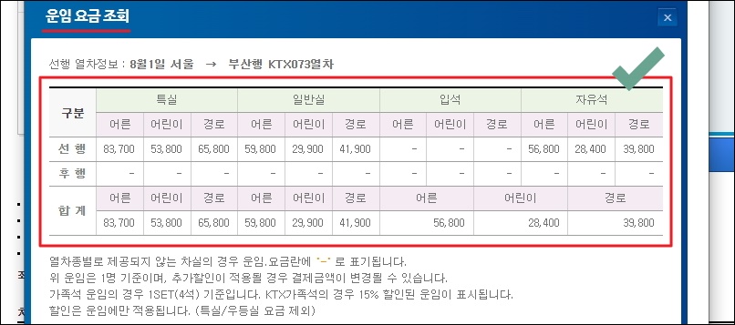 ▼운임표를 볼 수 있는 창이 나타났습니다. 해당 기차에 대하여 여러 상황에 따라 얼마의 운임이 발생하는지 확인이 가능한데요.  어른, 어린이, 노인에 따라 운임에서 조금씩 차이가 납니다.