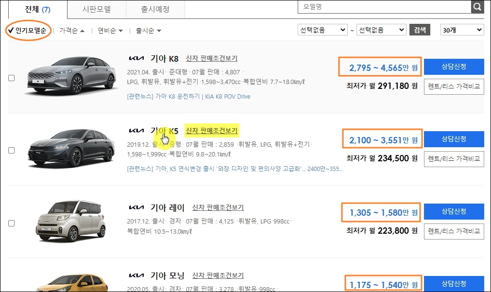 ▼제가 선택한 조건을 충족하는 기아차 모델이 7가지가 나왔습니다. 인기 모델 순으로 k8, k5, 레이, 모닝의 가격표가 보이는데요. 여기서 보이는 가격 범위를 한 번만 확인한 후 차량 모델을 클릭해 주세요. 참고로 기아차에서 매월마다 제공하는 판매조건을 확인하고 싶다면 [신차 판매조건보기] 버튼을 누르면 됩니다.