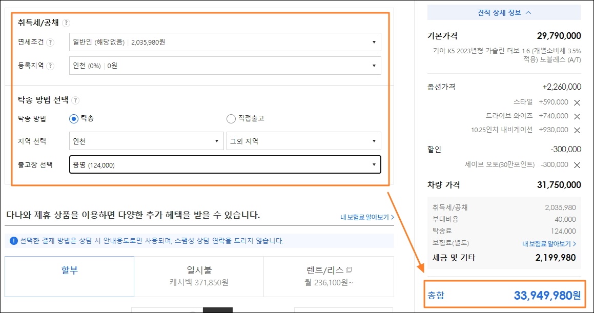이렇게 차례대로 여러 정보를 입력하면 우측에 있는 총합에 반영이 되는데요. 해당 금액이 우리가 알아보고자 하는 최종 구매 비용입니다. 깔끔하게 10원 단위까지 확인이 가능하죠.