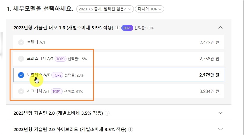▼이제부터 본인에게 맞는 세부모델, 옵션, 판매조건, 기타 사항을 선택하면 최종 가격표 확인이 가능합니다. 앞서 확인한 세부모델 정보를 바탕으로 세부모델을 선택해 주세요. 선호도에 따라 TOP 표시가 되어 있습니다.