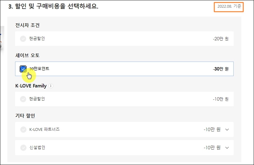 ▼가장 최근의 판매조건에 해당하는 내용이 나왔습니다. 여기에서 본인이 사용 가능한 조건을 선택하면 됩니다. 기아차 대리점에 있는 전시차를 구매하는 경우 20만원 할인을 받을 수 있네요.
