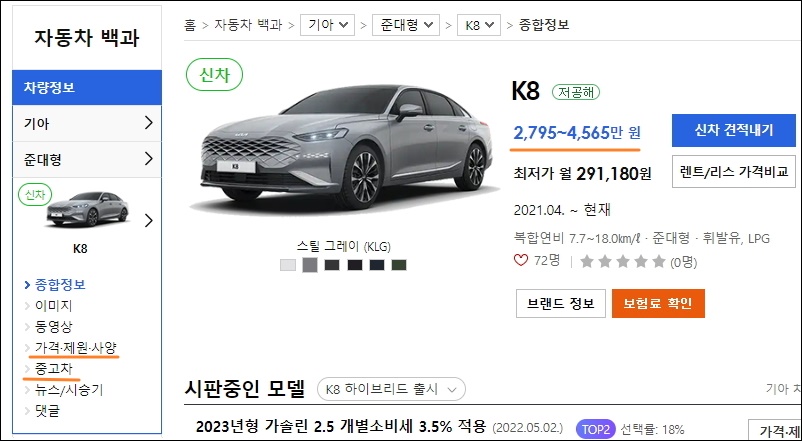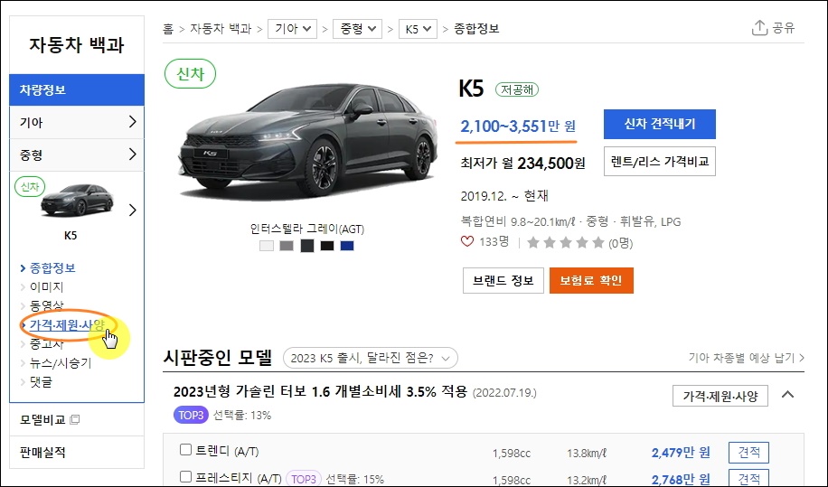 ▼저는 기아차에서 인기가 많은 모델 중 하나인 k5를 선택했습니다. k5에 대한 종합정보, 이미지, 동영상, 중고차 매물, 뉴스, 시승기 등의 정보를 확인할 수 있는 페이지가 열렸는데요. 좌측 메뉴에서 [가격, 제원, 사양]을 선택해 주세요.