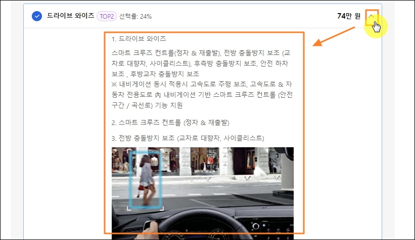 ▼옵션의 이름만 보고는 어떤 기능을 하는지 알 수 없죠. 이런 경우에는 가격 옆에 있는 화살표 아이콘을 클릭해 보세요. 그럼 상세 설명과 관련 사진이 나타납니다. 개인적으로 기아차의 드라이브 와이즈 옵션을 선호합니다. 이를 통해 여러 번 위험한 상황을 피할 수 있었기 때문이죠.