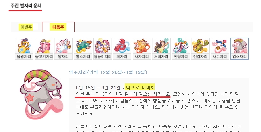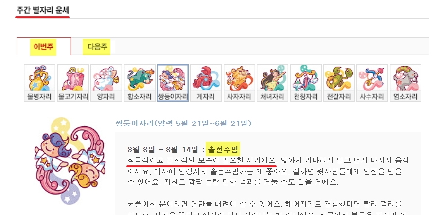 ▼두 번째로 이용해볼 주간 역술 서비스는 [주간 별자리 운세] 입니다. 여러 별자리 중에서 본인의 생년월일에 맞는 것을 선택하면 됩니다. 띠별 운세보다 좀 더 자세한 해석을 읽어볼 수 있는데요. 제 경우에는 이번주에 적극적이고 진취적인 모습이 필요하다고 합니다.