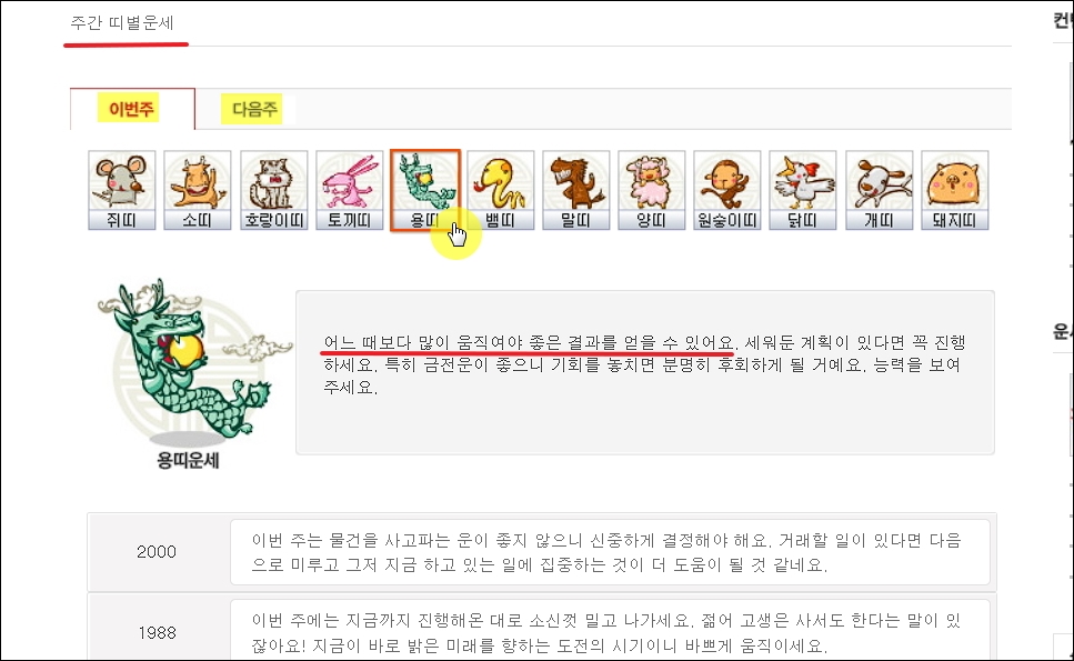 ▼주간 띠별운세 서비스를 선택했습니다. 12개의 띠 중에서 본인의 띠를 선택해 보세요. 그럼 풀이를 바로 볼 수 있습니다. 그 다음으로는 태어난 연도에 따라 차이가 있는 풀이 내용을 읽어볼 수 있는데요. 이런 식으로 이번주와 다음주에 들어오는 운에 대해 알아보면 됩니다.