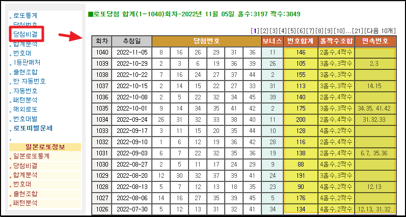 ▼ 이곳에서 제공하는 로또 관련 서비스는 여러 가지가 있습니다. 크게 통계 자료, 로또 당첨 번호 생성기, 관련 운세 이렇게 3가지로 나뉘는데요. 모두 한 번씩 이용해보고 본인에게 맞는 것을 골라서 사용하시면 됩니다. 앞서 많이 나오는 번호 순서를 확인하려면 좌측에 있는 메뉴에서 [로또 통계]를 선택하면 됩니다. 그 다음으로 제가 많이 사용하는 기능은 [당첨 비결] 입니다. 간단하게 매주마다 어떤 번호가 당첨이 되었는지 확인할 수 있죠. 여기에 더하여 번호합계, 홀짝수조합, 연속번호 정보도 표시되어 있습니다.