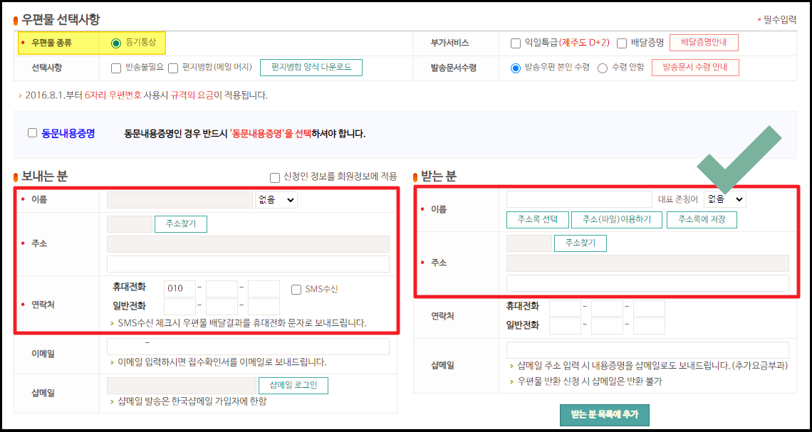 ▼ [신청] 버튼을 누르면 다음과 같이 보내는 분 받는 분 우편물종류 등의 정보를 입력하는 페이지가 열립니다. 이때 필수 정보는 빨간 점으로 표시가 되어 있으니 다음 단계로 넘어가기 위해서 해당 부분을 꼭 기재해 주시길 바랍니다.