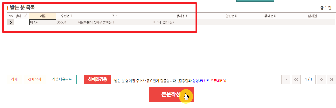 [받는 분 목록에 추가] 버튼을 눌러 주세요. 목록에 "받는 분"이 추가되면 [본문 작성] 버튼을 눌러 다음 단계로 넘어갑니다.