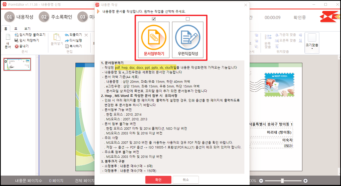 ▼ 기본적으로 우체국 사이트에서는 인터넷 브라우저에서 바로 문서 작성할 수 있도록 전용 편집기를 마련해 놓고 있습니다. PDF나 hwp DOC 등 여러 문서 파일을 첨부하는 것도 가능하고, 직접 편집기에서 내용증명 문서를 작성하는 것도 가능합니다. 특정 파일에 대해서 문서 첨부가 가능한 버전이 있고, 불가능한 버전이 있으니 이에  대한 내용은 다음 이미지를 참고해 주세요.