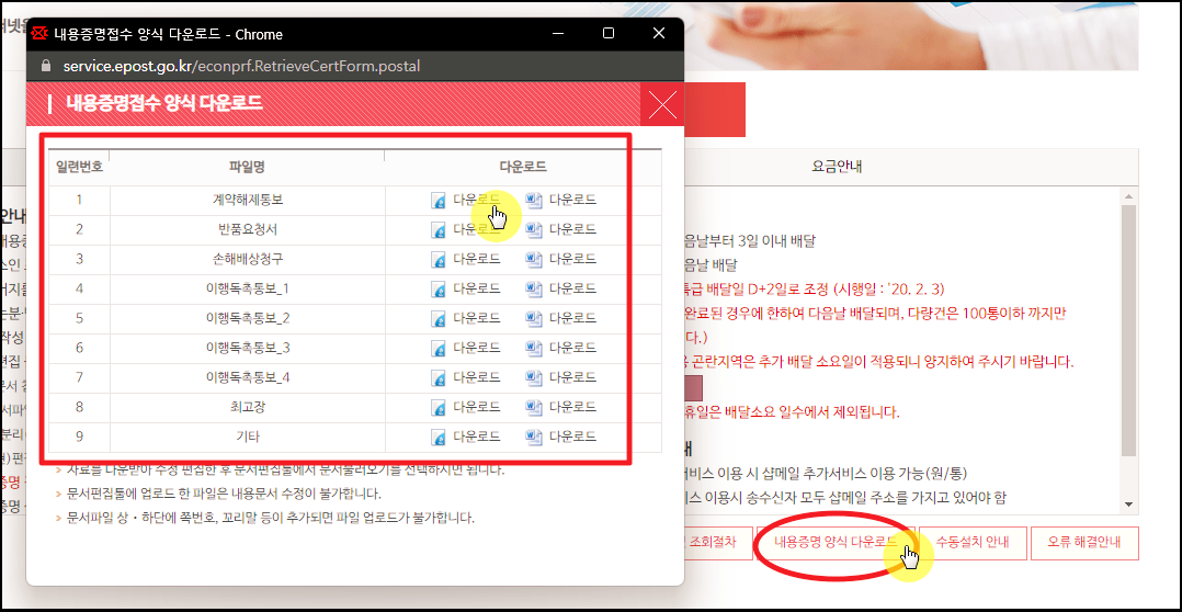 우측 하단에 있는 내용증명 양식 다운로드 버튼을 클릭해 보세요. 새로운 창이 열리면서 계약해지통보, 반품요청서, 손해배상청구, 이행독촉통보, 최고장 이렇게 9가지 내용증명 양식을 다운로드 받을 수 있도록 되어 있습니다. 한글과 MS워드 이렇게 2가지 파일 포맷으로 되어 있으니 마음에 드는 것을 다운 받아서  사용하면 됩니다.