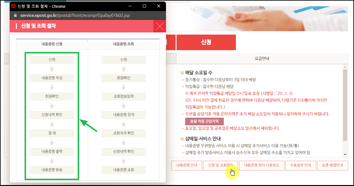 ▼ 내용증명 서비스 페이지가 열렸습니다. 이곳에서는 내용증명 발송을 신청하거나 열람 및 조회를 할 수 있는데요. 처음 이용하시는 분은 서비스 안내와 요금 안내 부분을 꼼꼼히 읽어 보시기 바랍니다. 다음과 같이 이용 방법을 알려주는 메뉴얼이 따로 있고, 신청 버튼을 누르면 내용증명 보내는 절차를 진행하게 됩니다.