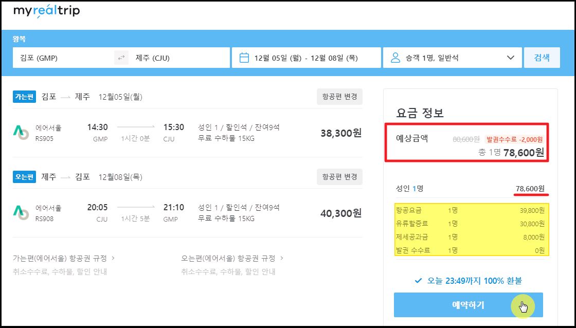 ▼ 저는 마이리얼트립 사이트를 선택했는데요. 발권 수수료를 2천 원 할인해 주네요. 금일 23시 49분까지는 예약을 진행한 티켓 환불이 가능합니다. 그리고 우리가 지금까지 스카이스캐너에서 사이트에서 찾았던 국내선 티켓의 가격에는 항공 요금, 유류할증료, 제세공과금, 발권수수료가 포함 되어 있습니다. 예약 사이트에서 표시된 내용을 꼼꼼씨 확인한 후 안내에 따라 예약을 진행하시면 돼요.