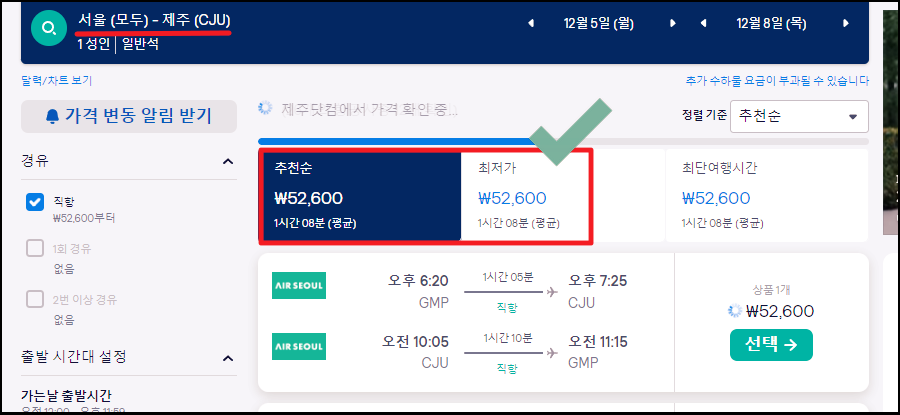 ▼ 현재 기준으로 제주도 비행기 표를 알아본 결과 52,600원 수준으로 저렴한 국내선 항공권을 찾을 수 있었습니다. 다음과 같이 예약 사이트를 이용하면 최저가 티켓을 찾기가 매우 쉬운데요. 순서대로 알려 드릴 테니 하나씩 따라해 보시길 바랍니다.