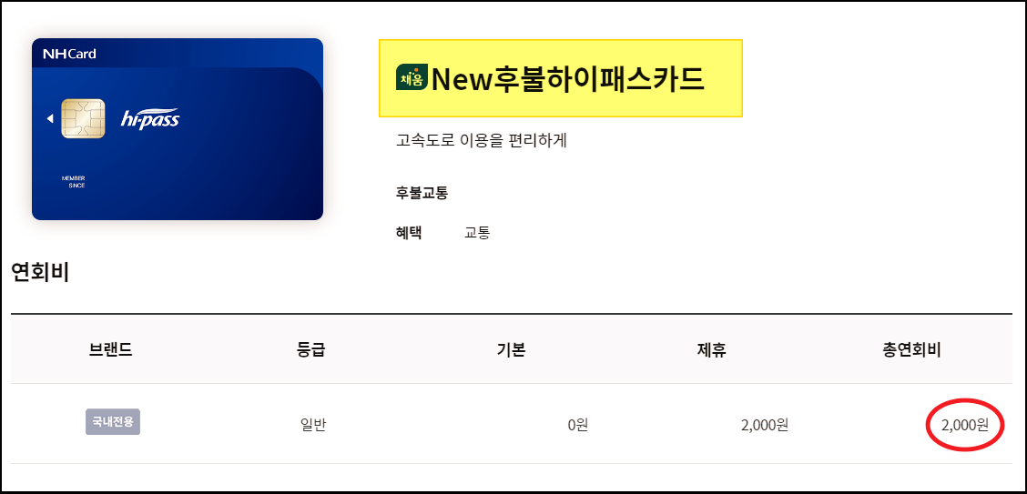 첫 번째로 언급하는 농협에 하이패스 후불카드는 채움 버전으로  카드 이름은 "뉴후불 하이패스카드"입니다. 고속도로 이용을 편리하게 해주는  상품인데요. 총 연회비는 2,000원입니다. 브랜드는 국내 전용이지요.