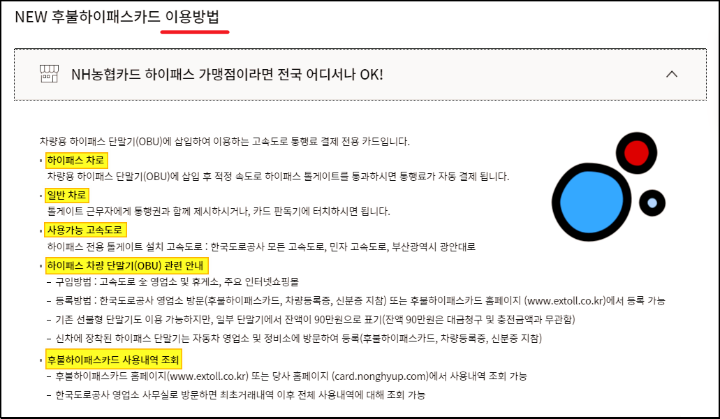 ▲ 첫 번째로 언급하는 농협에 하이패스 후불카드는 채움 버전으로 카드 이름은 "뉴후불 하이패스카드"입니다. 고속도로 이용을 편리하게 해주는 상품인데요. 총 연회비는 2,000원입니다. 브랜드는 국내 전용이지요.
