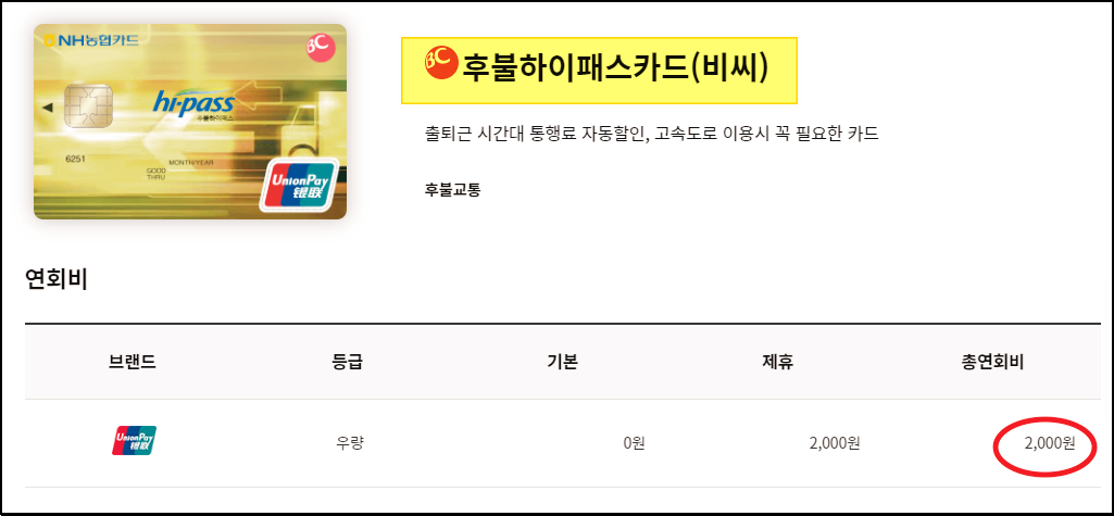 ▲ 비씨 버전인 후불 하이패스 카드는 위와 같이 생겼습니다. 해당 카드의 경우에도 농협에서 발급 신청이 가능하고요. 연회비는 2,000원입니다.