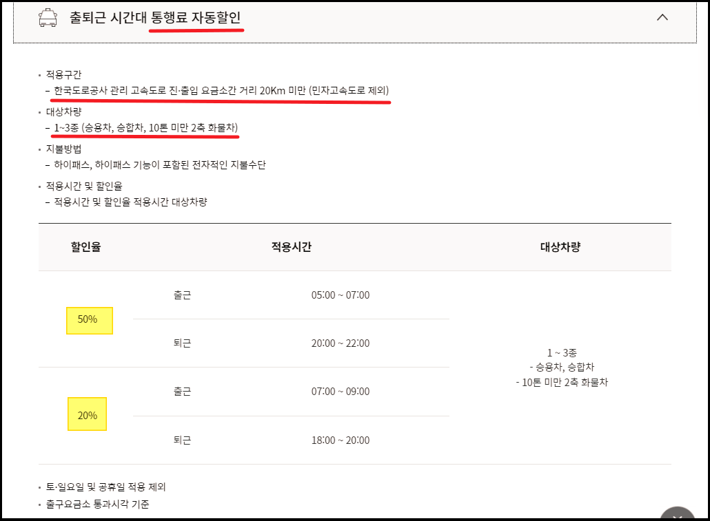 토요일이나 일요일 그리고 공휴일에는 할인 적용이 제외 되고요. 여기서 말하는 적용 시간은 출구 요금소 통과 시각을 기준이오니 이 점을 참고해 주시길 바랍니다.