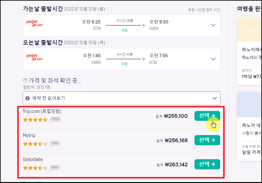 항공편 선택 이후에는 베트남 항공권 예매를 진행할 수 있는 사이트 및 업체를 선택해야 합니다. 가장 저렴한 곳을 선택하거나 평점이 높은 곳을 선택하면 됩니다.