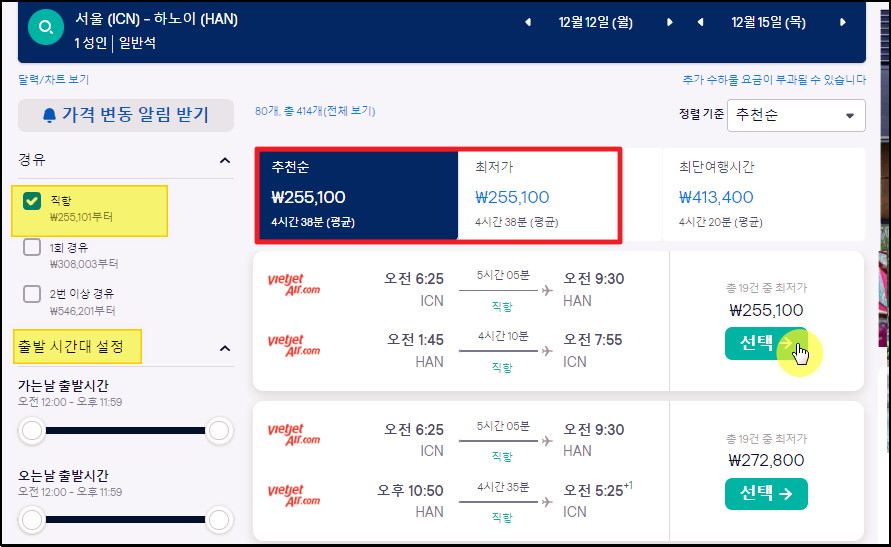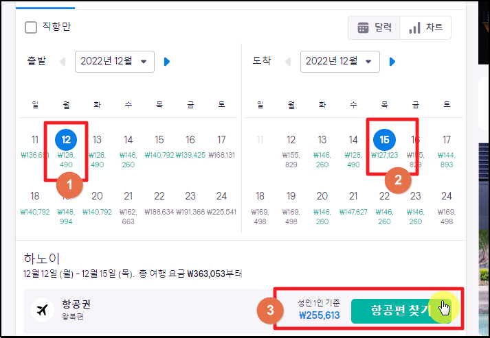 본인의 여행 일정을  감안하여 최대한 저렴한 날을 선택해 주세요. 제 경우에는 베트남 하노이로 다녀오는 왕복항공권의 가격이 255,613 원이네요.