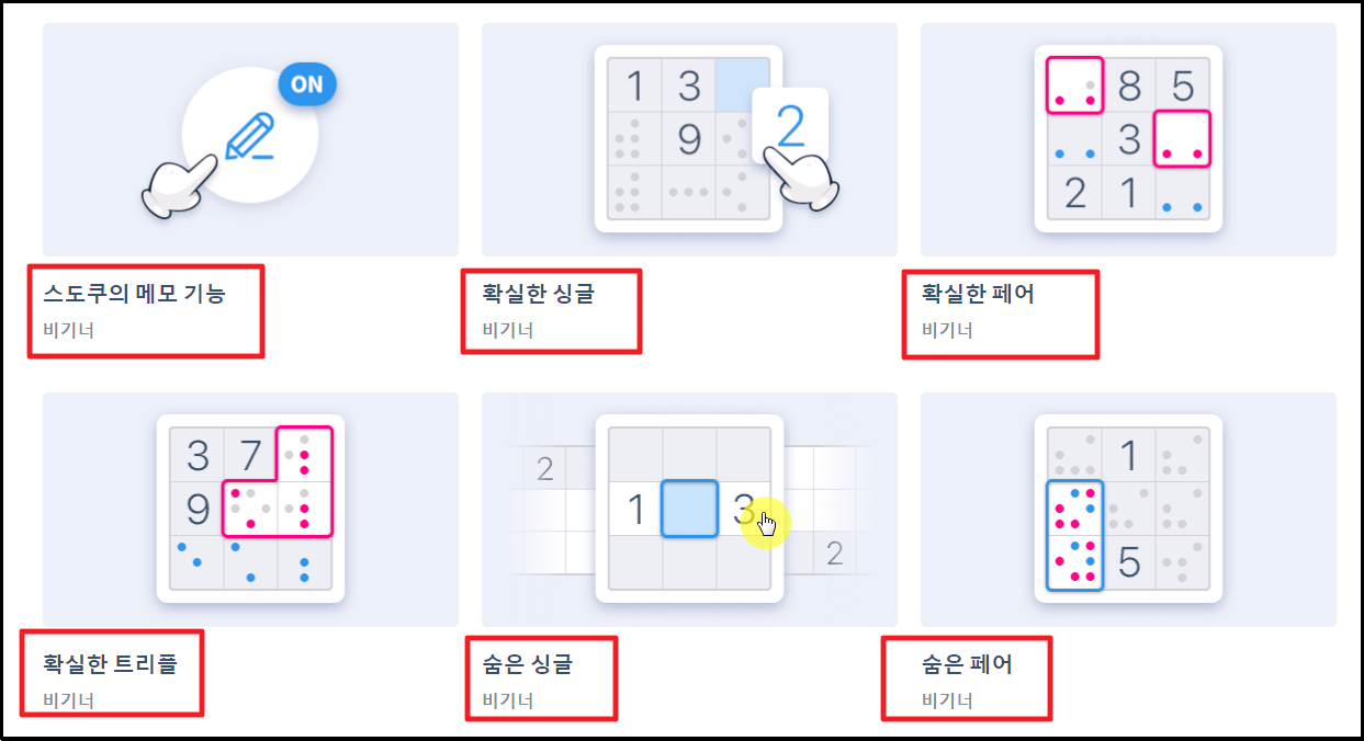 그럼 스도쿠의 메모 기능, 확실한 싱글, 확실한 페어, 숨은 페어, 숨은 싱글, 확실한 트리플 등 스도쿠 푸는법에 대하여 자세히 나와 있습니다. 이러한 방법이나 요령을 숙지하고 있으면 좀 더 제대로 즐기면서 게임하기 좋습니다.