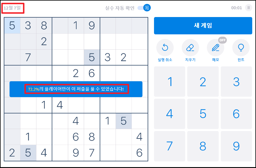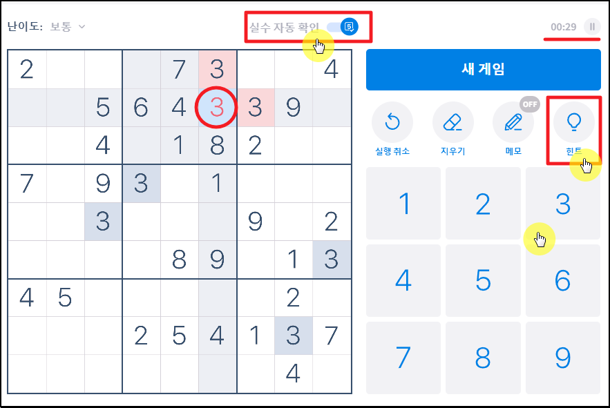 퍼즐 기준으로 우측 상단에 보면 "실수 자동 확인" 기능이 있는데요. 해당 기능을 켜놓으면 스도쿠 게임을 진행하다가 규칙에 맞지 않는 숫자를 입력했을 때 바로 알림을 받을 수 있습니다.