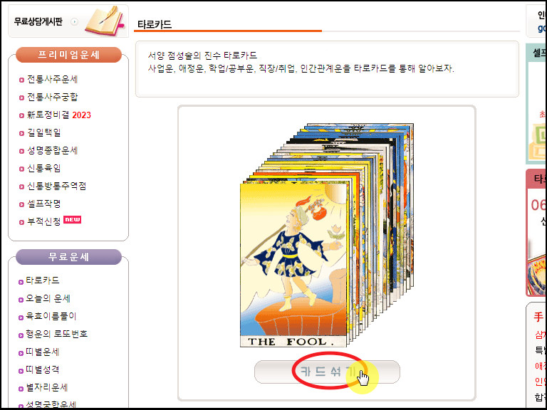 ▲ freesaju 넷 사이트에 접속했습니다. 메인화면에서 좌측에 보면 무료로 이용할 수 있는 운세 목록이 나타나는데요. 여기에서 [타로카드] 메뉴를 선택해 주세요. 그럼 서양의 신비로운 점성술인 타로카드점을 볼 수 있습니다.