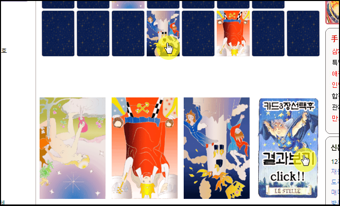 카드가 다 섞였으면 뒷면만 보이는 여러 장의 타로카드가 나타나는데요. 여기에서 3장을 선택하면 됩니다.