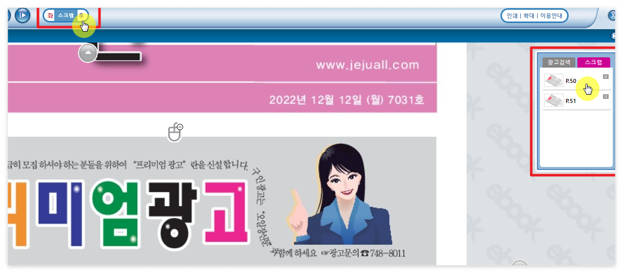 오른쪽 상단에 있는 스크랩 기능을 통해 저장한 지면을 바로 찾아볼 수 있어요. 이런 식으로 집에서 편하게 제주 오일장 신문 보기 가능합니다.
