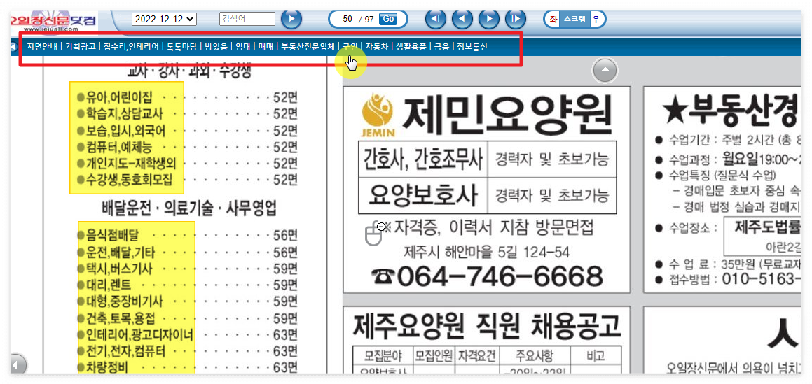 ▲ 새로운 인터넷 창이 열리면서 우리가 평소에 종이 신문으로 보던 제주 오일장 지면이 나타나는데요. 화면에서 상단 부분에 보면 카테고리가 있습니다.