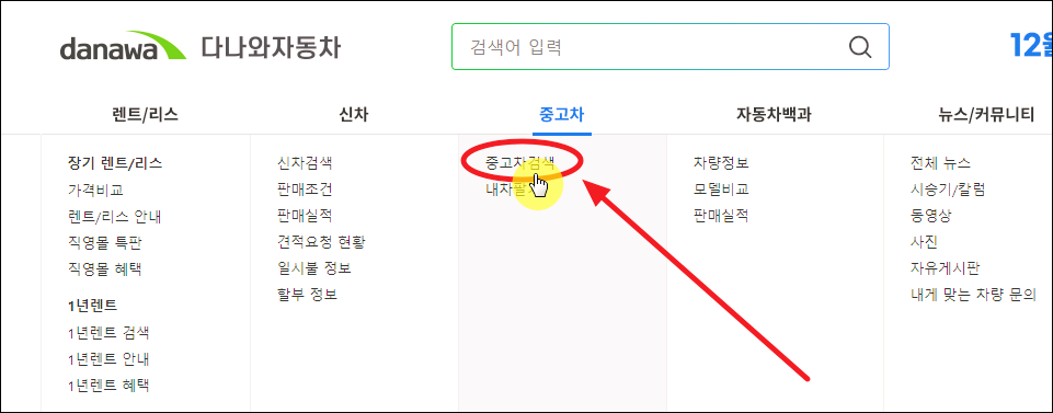 ▼ 다나와 자동차 홈페이지에서는 렌트카, 리스차량, 신차, 중고차에 대한 가격 전부를 알아볼 수 있습니다. 자동차 백과 메뉴를 보면 판매실적이나 여러 자동차 모델을 비교해보는 것도 가능하죠. 이번 시간에는 싼타페 중고차 가격을 제대로 알아보겠습니다. 메뉴에서 [중고차 검색] 버튼을 클릭해 주세요.