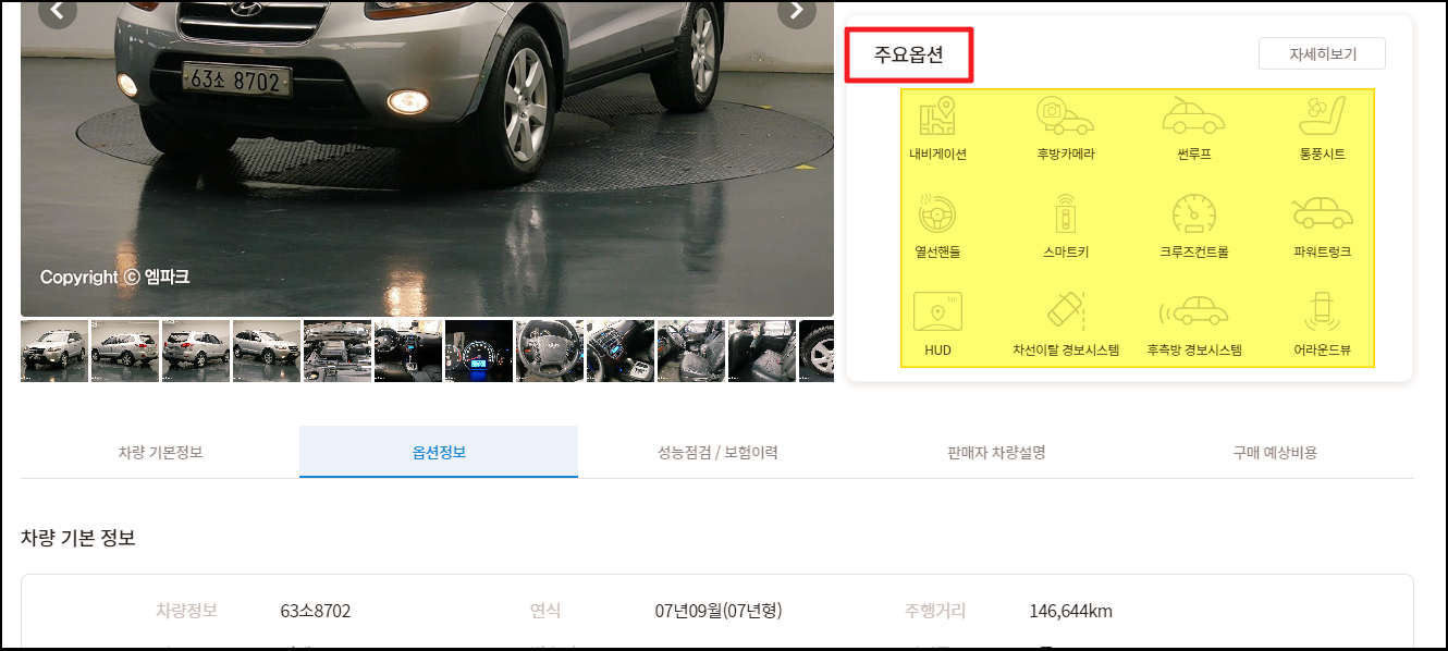 ▼ 싼타페를 중고차로 구매하는 경우에는 옵션 여부를 꼭 확인하는 것이 좋습니다. 신차와 달리 중고차의 경우에는 옵션을 내 마음대로 정하기 어렵기 때문입니다. 네비게이션, 후방카메라, 썬루프, 통풍시트, 스마트키, 크루즈컨트롤 등 여러 옵션이 있으니 마음에 드는 옵션이 갖추어져 있는지 확인해 보세요.