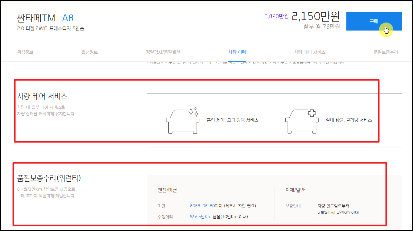 ▼ 앞서 언급한 부분 외에 검사나 차량 이력을 확인할 수 있고, 매물마다 차량 케어 서비스나 품질 보증 수리 서비스를 제공하는 것이 있습니다. 중고차를 구매할 때에는 가격이 무조건 저렴한 것보다 이러한 보증 서비스가 어느 정도 갖추어 진 것이 좋습니다. 싼타페 중고차 가격 시세표를 확인하면서 이러한 내용도 함께 보시길 바랍니다.