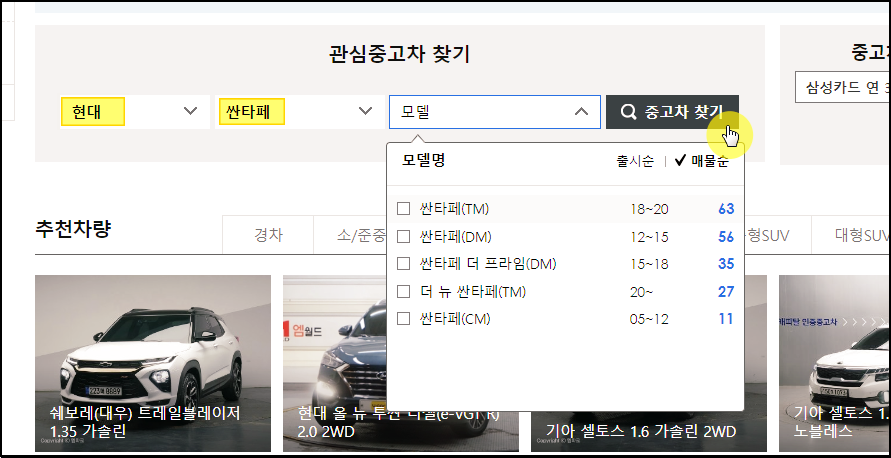 ▼ 이동한 페이지에서 관심 중고차 찾기를 진행해야 하는데요. 브랜드는 "현대", 시리즈는 "싼타페", 모델명은 본인이 원하는 모델을 선택하면 됩니다. 많은 매물로 구성된 중고차 가격 시세표를 확인하고 싶다면 모델명은 선택을 하지 않는 것이 좋습니다. 다 입력했으면 [중고차 찾기] 버튼을 클릭해 주세요.