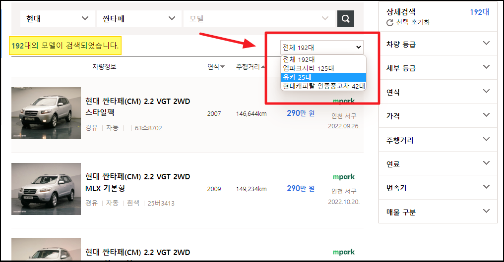 ▼ 여러 중고차 사이트에 올라온 매물의 가격을 한 번에 모아서 볼 수 있는 시세표 서비스가 있습니다. 표를 통해 여러 싼타페 매물에 대한 간단한 차량 정보, 연식, 주행거리, 등록일을 확인할 수 있죠. 여기에 더하여 상세검색 기능을 통해 적정 시세를 파악하기에도 용이하죠. 각 매물을 클릭하면 상세 정보와 구입 신청도 가능합니다.