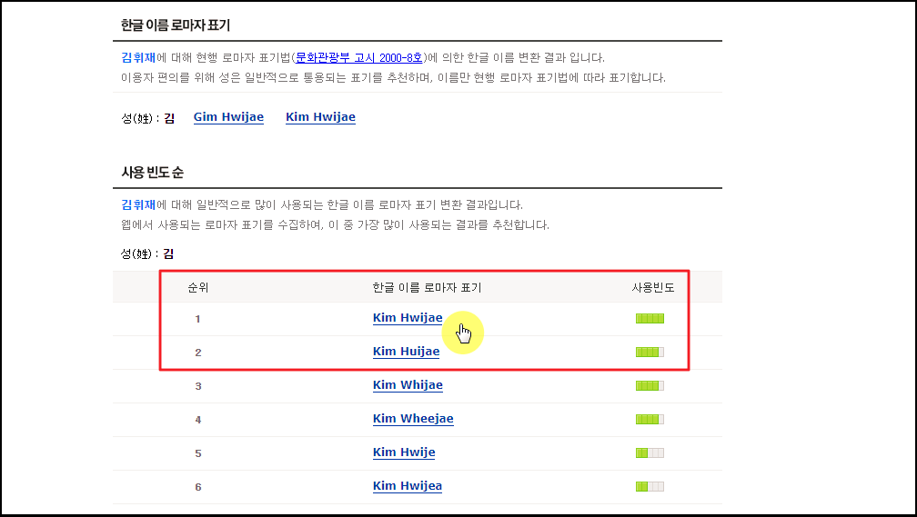 ▼ 저는 "김휘재"라는 이름을 검색해 보았는데요. 이에 따라 앞에서 보았던 것과 같은 영어 이름 결과가 여러 개 나타났습니다. 사용 빈도 순 영역을 보면 순위와 영어 이름이 나타나는데요. 상위권에 속하는 것 중에서 마음에 드는 것을 선택하여 사용하면 됩니다. 좀 더 확실하게 하고 싶다면 여기에 있는 변환기 결과(영문 이름)를 마우스로 클릭해 보세요.