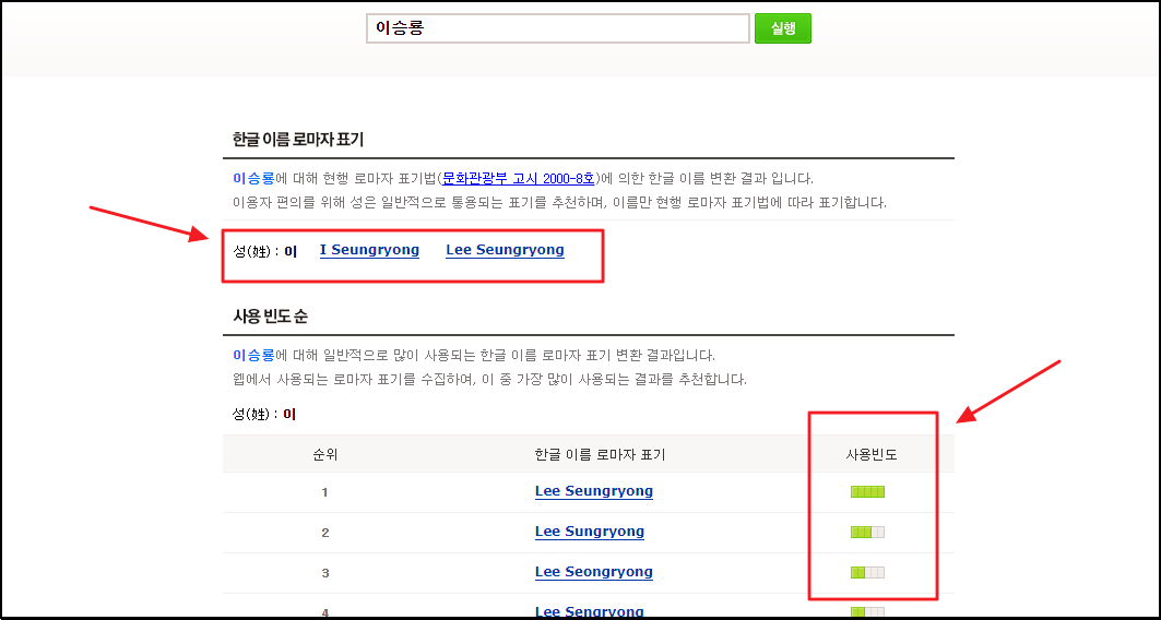 ▼ 여권을 만들거나 자신에 대한 정보를 외국인 상대로 문서를 작성해야 할 때가 있죠. 이때 로마자 표기를 제대로 해야 하는데요. 단순 번역을 하면 이상해 보일 수 있습니다. 다음과 같이 사용빈도를 함께 보면 어떤 영어 표기를 사용하는 것이 적절한지 쉽게 파악할 수 있죠.