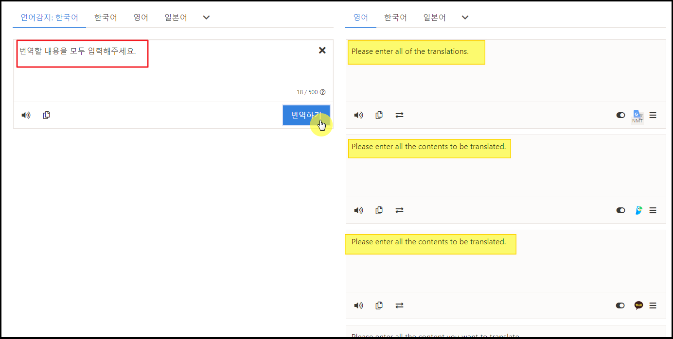 ▼ 번역기들 사이트에 접속했습니다. 사용하는 방법은 간단합니다. 좌측에 있는 빈 칸에 번역할 내용을 한글로 입력합니다. 그 다음 [번역하기] 버튼을 눌러보세요. 그럼 바로 우측에 여러 가지 한글 영어 변환기의 결과가 나타납니다. 같은 한글 문장을 입력했음에도 불구하고, 제각각 다른 영어 문장으로 된 결과를 나타내는데요. 여기에서 마음에 드는 결과를 선택하여 사용하면 됩니다.