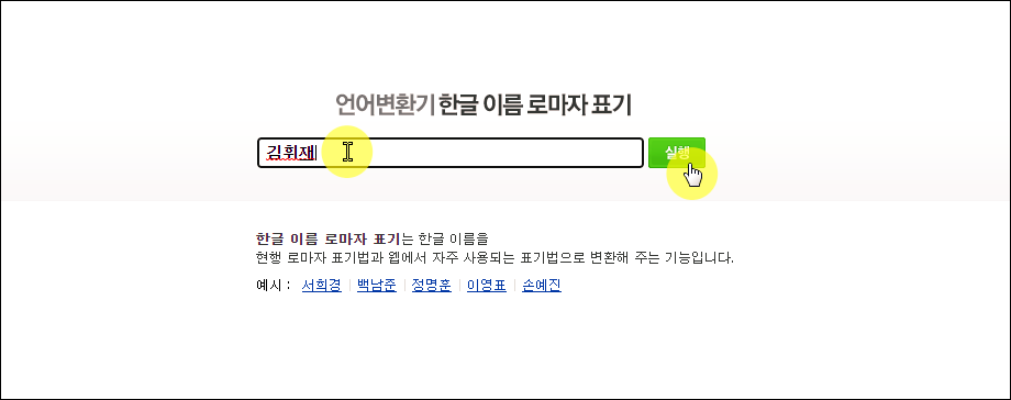 ▼ 언어변환기 한글 이름 로마자 표기 검색창이 나타났습니다. 여기에 영어로 변환하고 싶은 한글 이름을 입력한 후 [실행] 버튼을 클릭해 주세요.
