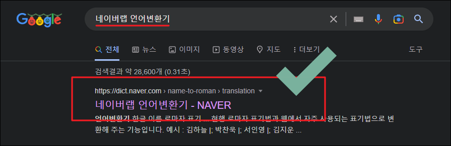 ▼ 두 번째는 한글 이름에 대한 영어 변환기에 대해 알려드리겠습니다. 네이버랩 언어변환기 사이트를 이용하면 되는데요. 검색을 통해 해당 사이트에 접속해 주세요.