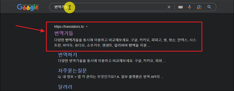 ▼ 일단 기본적으로 여러 분야에 대하여 사용할 수 있는 영어 변환기 서비스를 알려드리겠습니다. "번역기들"이라는 사이트를 이용해 볼 건데요. 무료로 사용할 수 있고, 이름 그대로 여러 가지 한글 영어 변환기 서비스를 한 번에 모두 사용할 수 있는 서비스를 제공하고 있습니다. 이를 통해 얻은 결과 중에서 어떤 것이 제일 마음에 들게 번역을 했는지 쉽게 파악이 가능하죠.