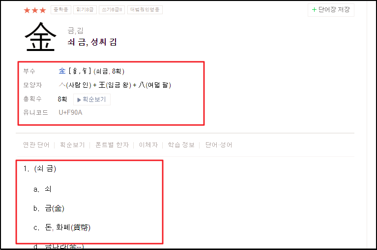 ▼ "쇠 금"이라는 한자에 대해 상세하게 알아볼 수 있는 페이지를 열어보았어요. 부수, 모양자, 총획수, 유니코드, 대법원인명용 해당 여부, 읽기 및 쓰기 난이도 등 여러 가지 정보가 많이 있어요. 뜻풀이 내용을 보면 웬만한 옥편보다 많은 정보를 담고 있음을 알 수 있죠.