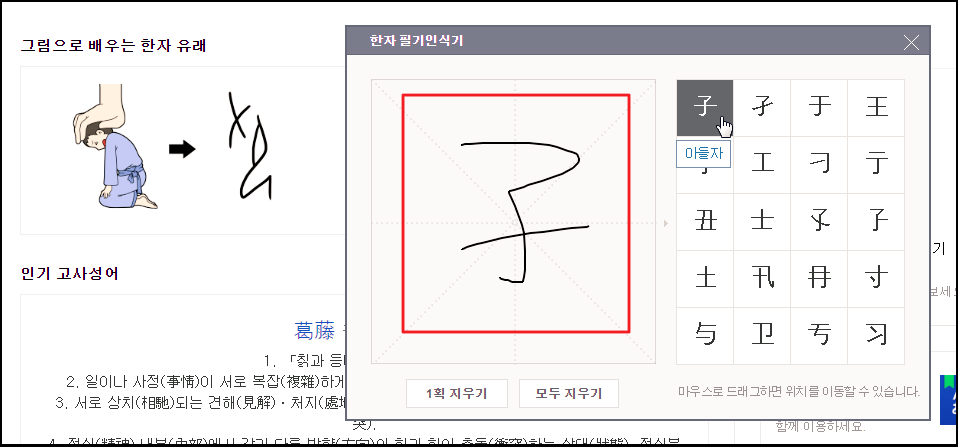 ▼ 우리가 이번 시간에 사용할 한자 검색기는 다음과 같은 필기인식 기능을 갖추고 있어요. 마우스나 손가락으로 쓰윽 그리기만 하면 알고 싶은 한자를 검색기에 입력할 수 있죠. 여기에 더하여 그림으로 한문의 유래를 배우거나 인기 고사성어나 단어 등 많은 것을 추가적으로 학습하거나 알아볼 수 있습니다.