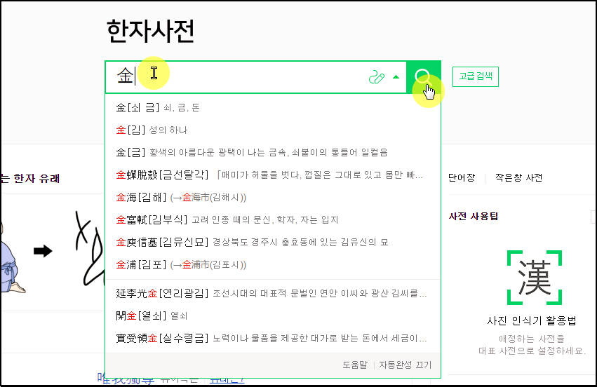 ▼ 저는 "쇠 금"이라는 한자를 그려서 검색기에 입력했어요. 이에 따라 자동으로 완성된 관련 검색어가 나타나는데요. 사람들이 많이 찾는 검색어이기 때문에 본인이 찾으려고 하는 단어나 고사성어가 나타날 수 있어요. 하나의 문자든 단어든 고사성어든 알고 싶은 것을 클릭해 주세요.