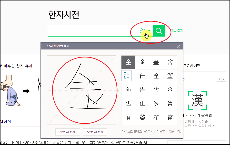 ▼ 한자사전 페이지가 열리면 필기인식기 프로그램을 열어야 하는데요. 검색기 입력란에 보면 오른편에 필기 모양의 아이콘이 있어요. 이 버튼을 클릭하면 나타나요. 필기인식기 사용법은 간단해요. 좌측에 있는 빈 공간에 검색기로 찾고 싶은 문자의 모양을 그려주세요. 그럼 오른편에 이와 유사하게 생긴 한자가 20개 나타나는데요. 여기에서 선택하면 돼요.