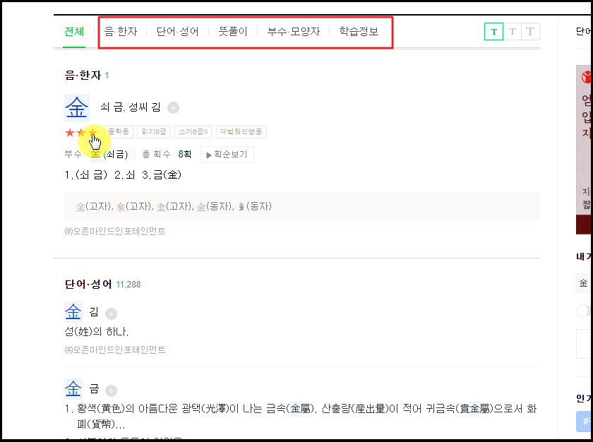 ▼ 그냥 검색 버튼을 눌러보면 이렇게 많은 결과가 나타나는데요. 하나의 한자에 대해서 상세히 알아보거나 관련 단어, 성어, 부수, 모양자, 학습정보 내용을 살펴보는 것이 가능해요. "쇠 금"에 관련된 단어와 성어가 11,288개나 검색이 되었네요.