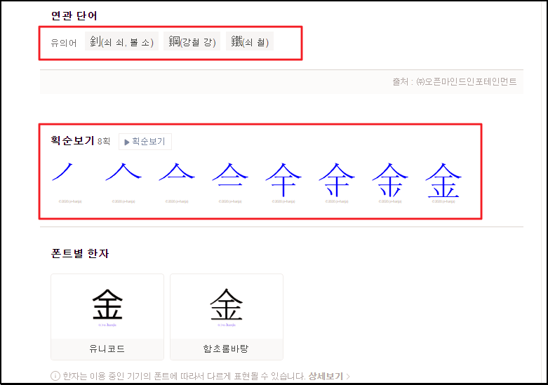 ▼ "쇠 금"이라는 한자에 대해 상세하게 알아볼 수 있는 페이지를 열어보았어요. 부수, 모양자, 총획수, 유니코드, 대법원인명용 해당 여부, 읽기 및 쓰기 난이도 등 여러 가지 정보가 많이 있어요. 뜻풀이 내용을 보면 웬만한 옥편보다 많은 정보를 담고 있음을 알 수 있죠.