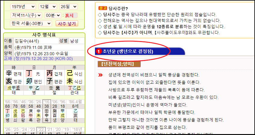 ▲ 중국 당나라때 유행했던 점술인 당사주가 나왔습니다. 당사주 풀이 보는법은 간단합니다. 위에서부터 아래로 보면 되는데요. 가장 먼저 초년운, 중년운, 말년운, 평생운을 훑어보아 주세요. 그 다음 이어지는 개별운을 상세하게 읽어보면 됩니다.