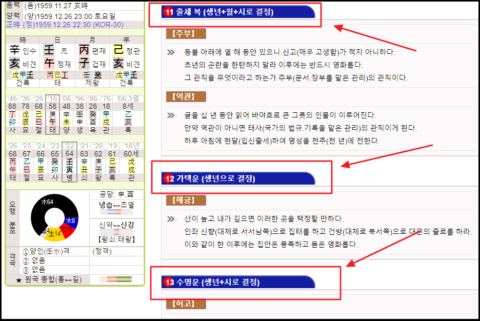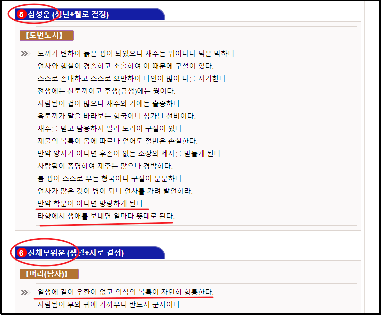 ▲ 평생운 부분을 보면 나이에 따라 나의 운명이 어떤 흐름을 타고 가고 있는지 알 수 있습니다. 10세 이전부터 노인이 될 때까지 자신이 어떤 인생을 살아가게 될 지 궁금한 분들은 꼭 한 번 평생운을 보는 것이 좋습니다.